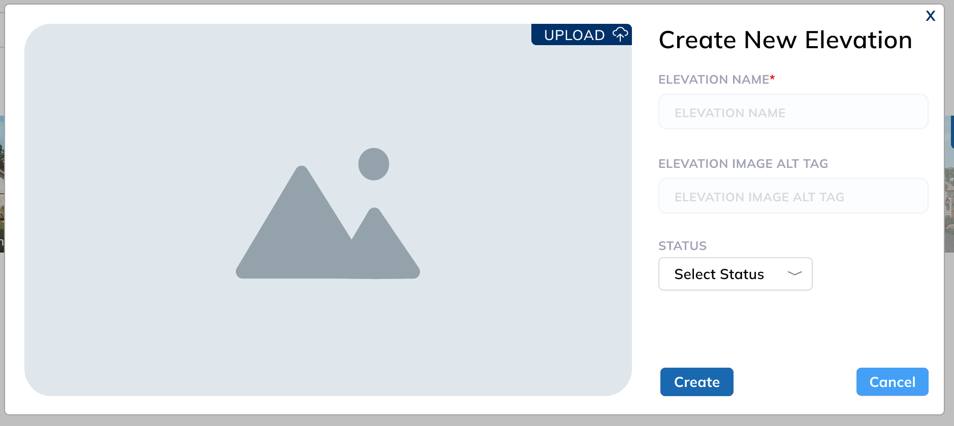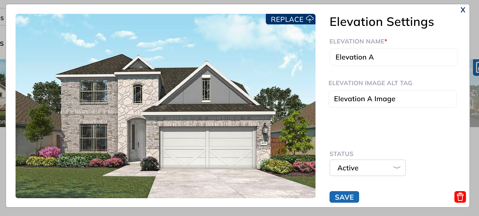 - Elevations image + button to replace or upload the image