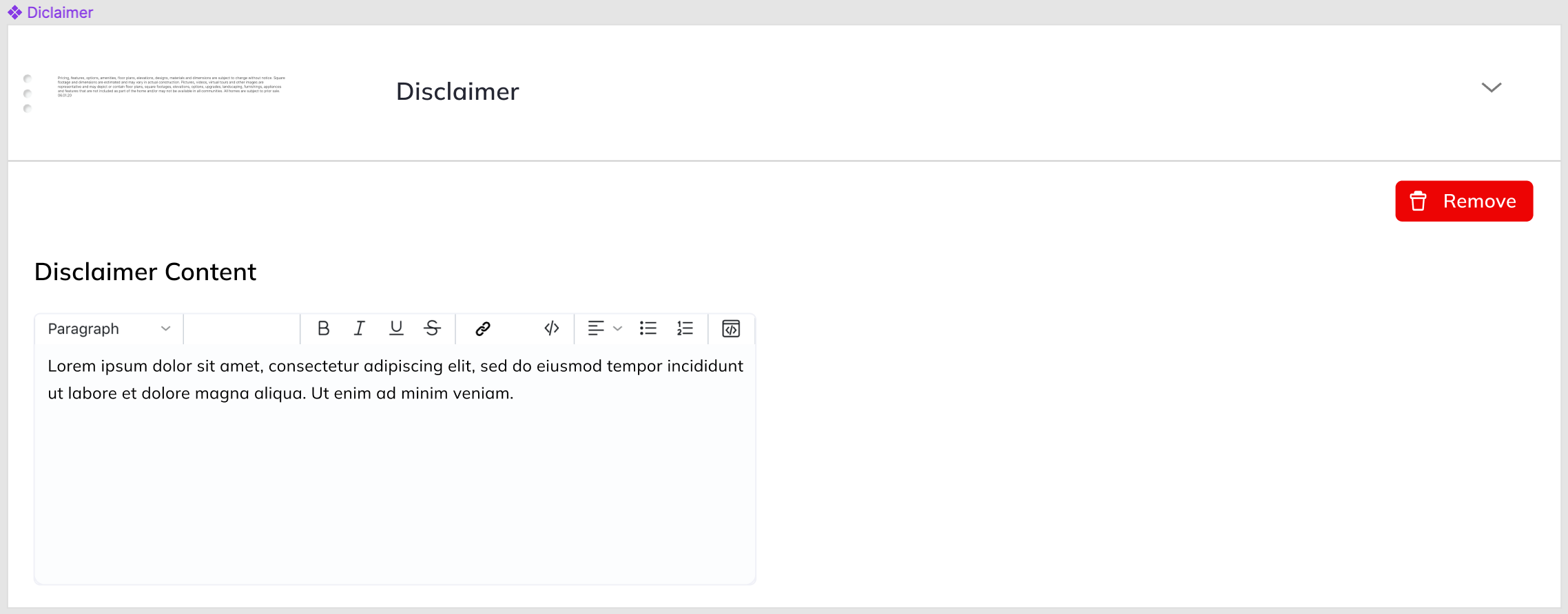 ComponentsWeb Pages ModulesDisclaimerOn this pageDisclaimerDescriptionFront-end design described HEREBasic text disclaimer. Rich text editor.Design