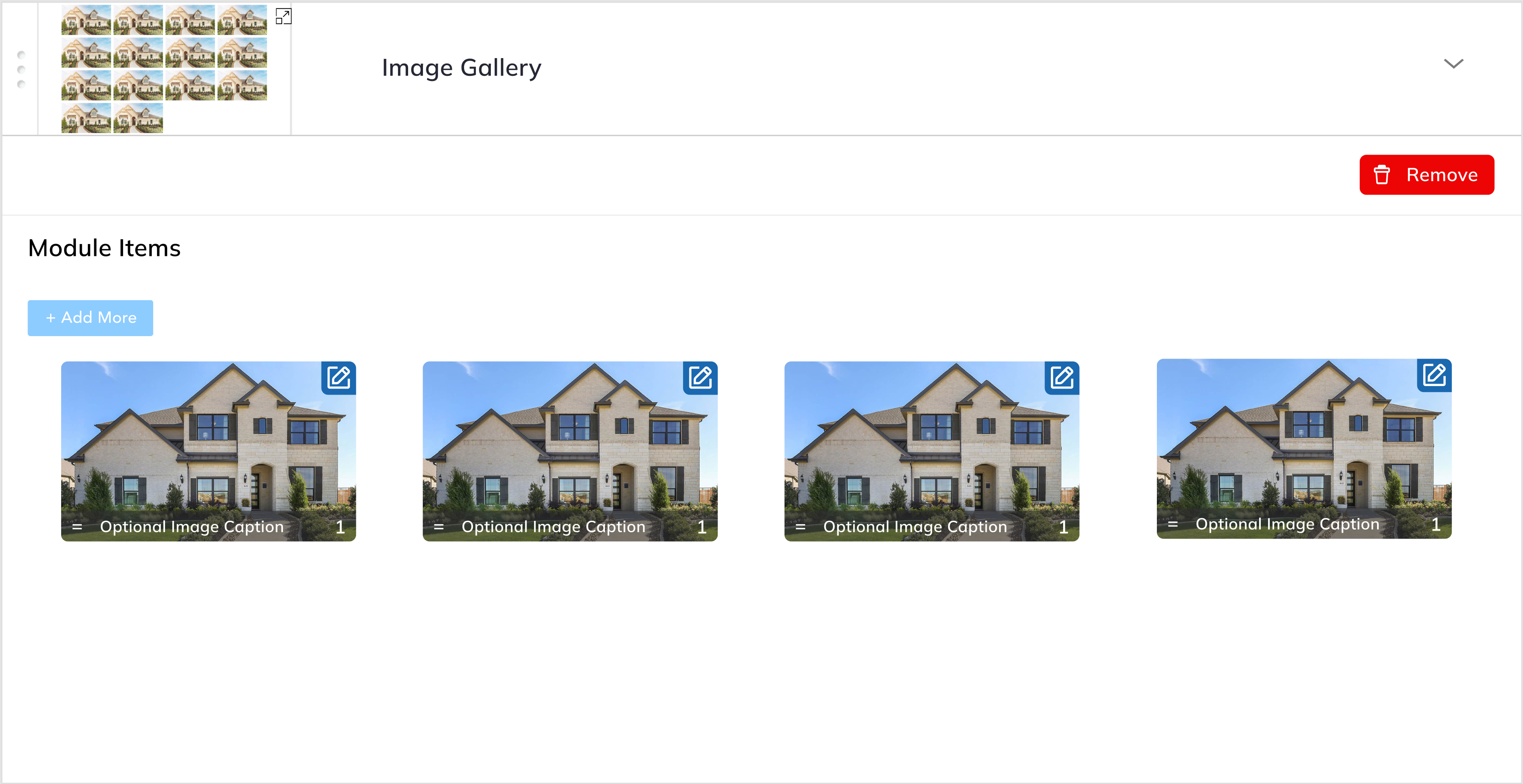 ComponentsWeb Pages ModulesImage GalleryOn this pageImage GalleryDescriptionFront-end design examples described HERESimple Image Gallery Module.Users can:Upload imageschange images orderSet SEO img ALT tag and CaptionDelete / Replace imagesDesign