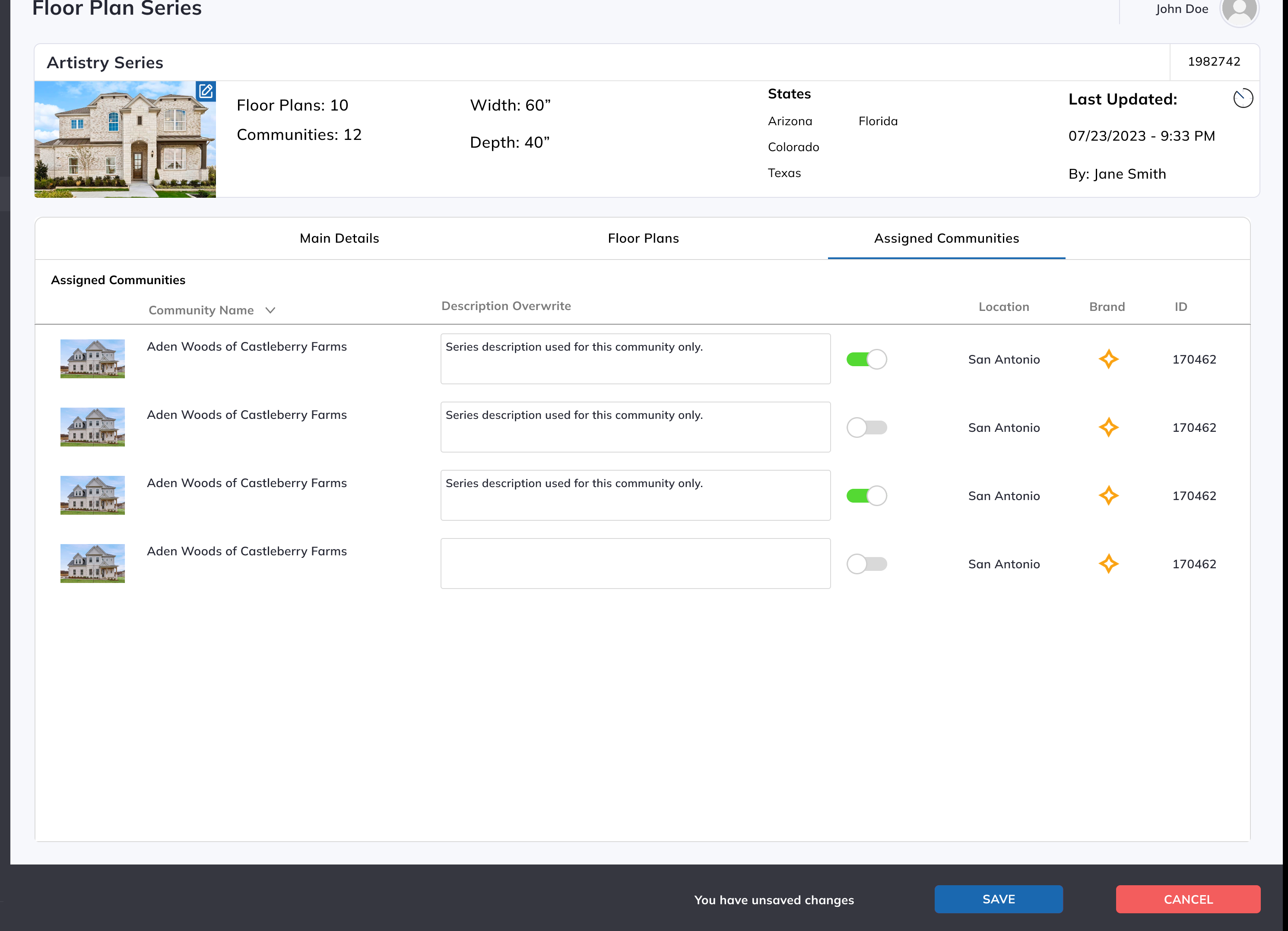 On this tab, user can view a list of Communities which have any Floor Plans (Community Floor Plans) from this series.User has an option to add Series Description, for each community, to overwrite Default Sereis description on Community basis.
