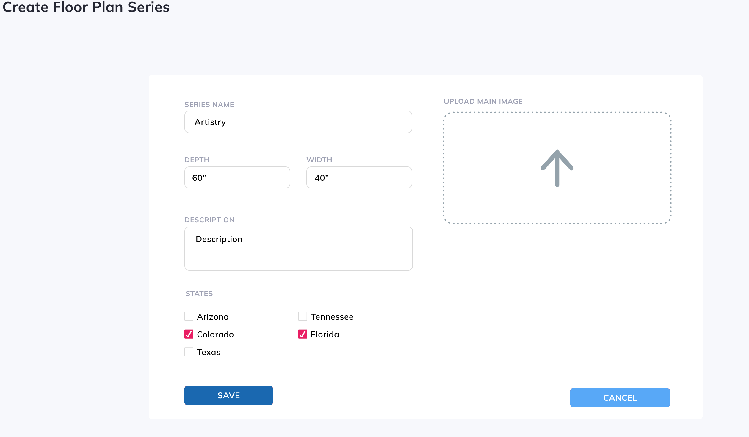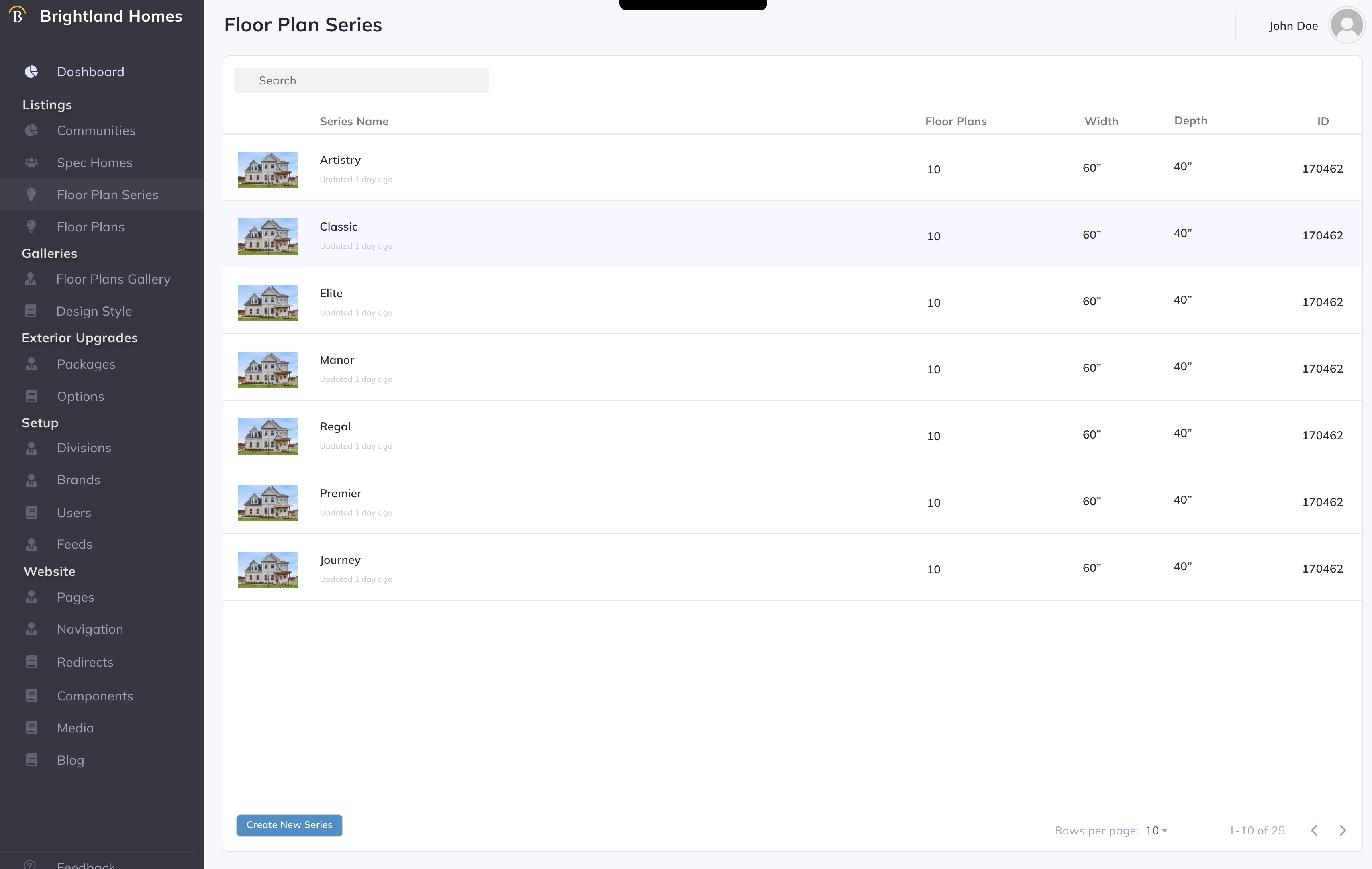 Series List page is a basic list of all Floor Plan Series with option to Search by name and Create New Series