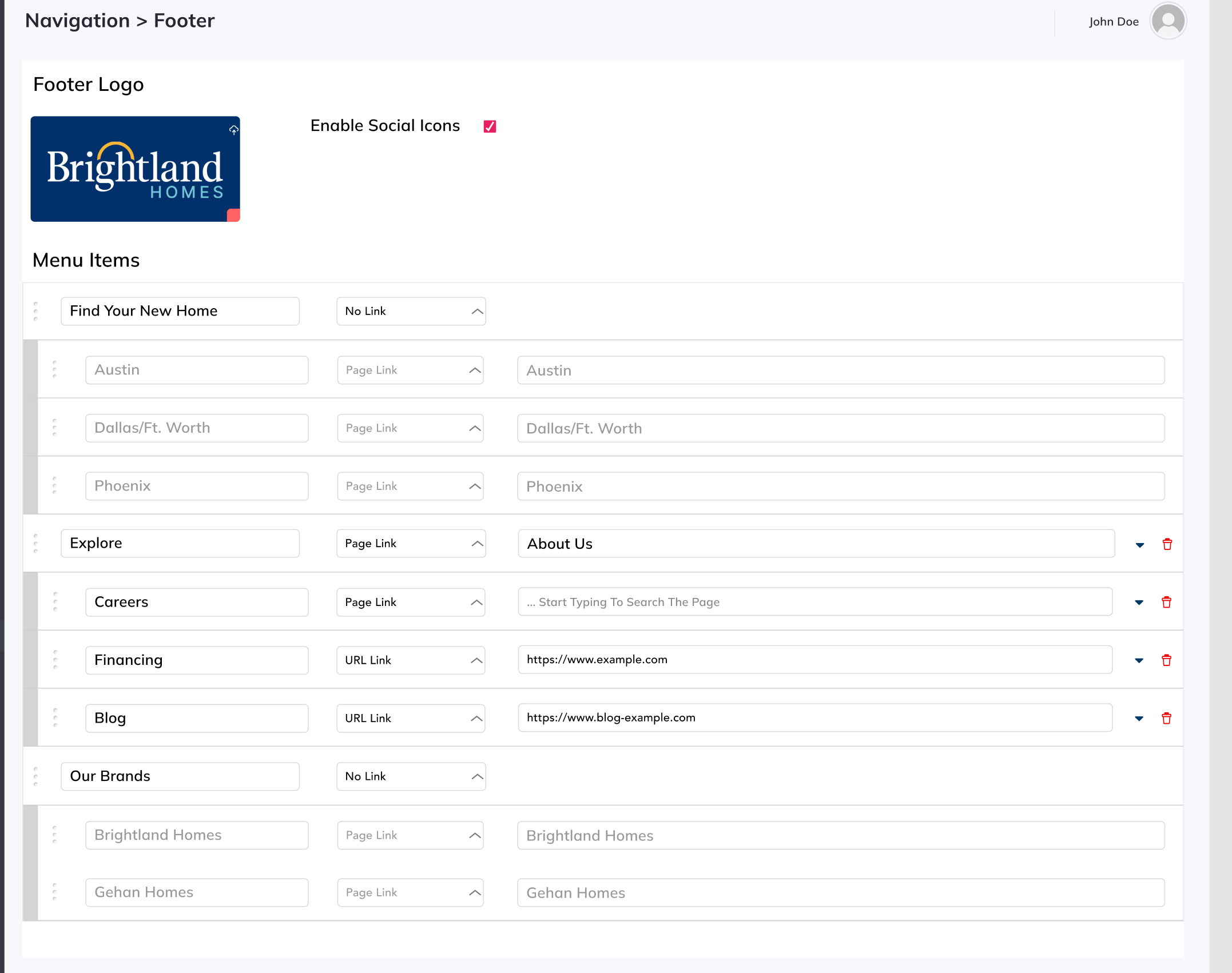 Footer will always have “Find Your New Home” section as column 2. User can rename it, change parent type, but not delete. “Find Your New Home” menu will always have all active divisions listed. User can re-arrange divisions, but no other changes permitted.