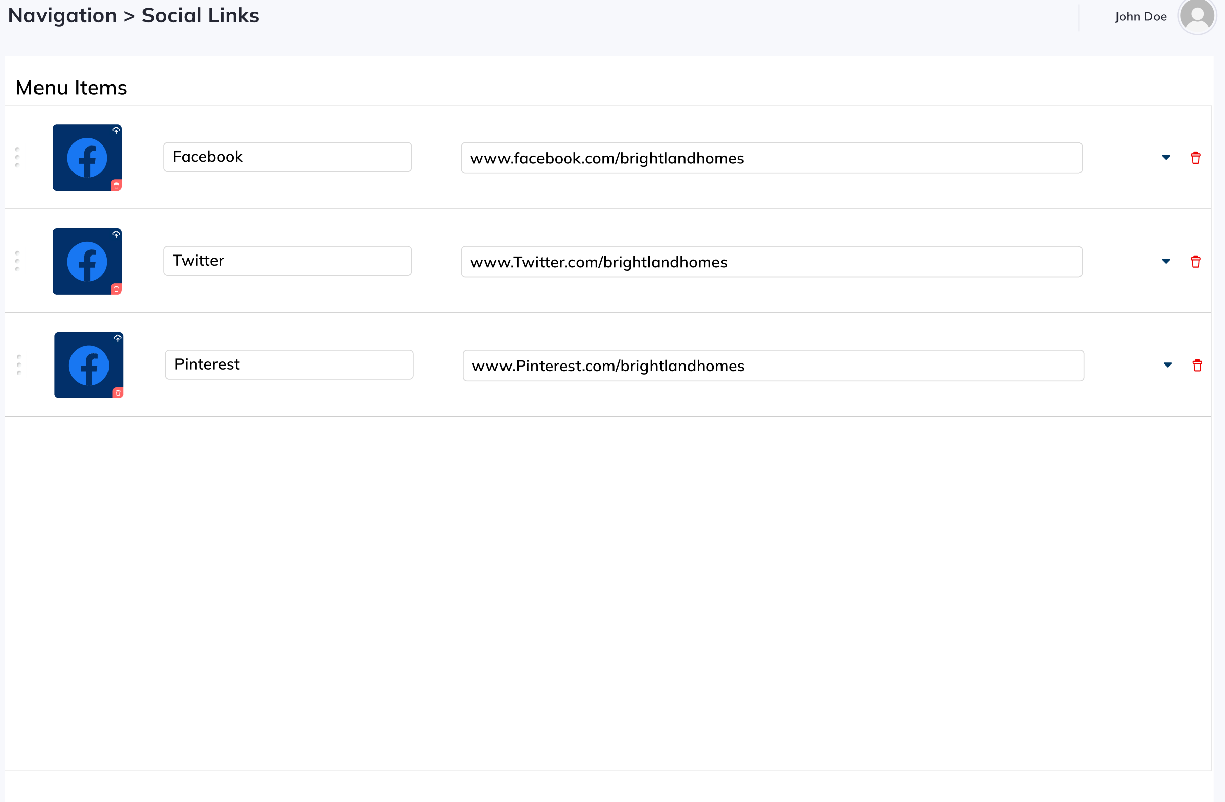 PagesWebsiteNavigationSocialSocialFront-end Design Described HERE.User can add 0 to 8 social links / icons.User can change:social link iconlink namelink URLExample: