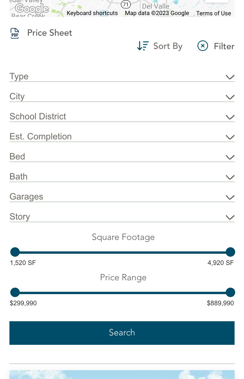 Range, based on current inventory available. (Min/Max Square Footage) Slider.