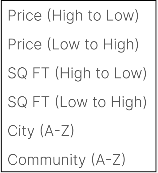 ComponentsFiltersSort ByOn this pageSort ByDescriptionSort by is a simple sorting dropdown with these options:Price (High to Low)Price (Low to High)SQ FT (High to Low)SQ FT (Low to High)City (A-Z)Community (A-Z)Examples