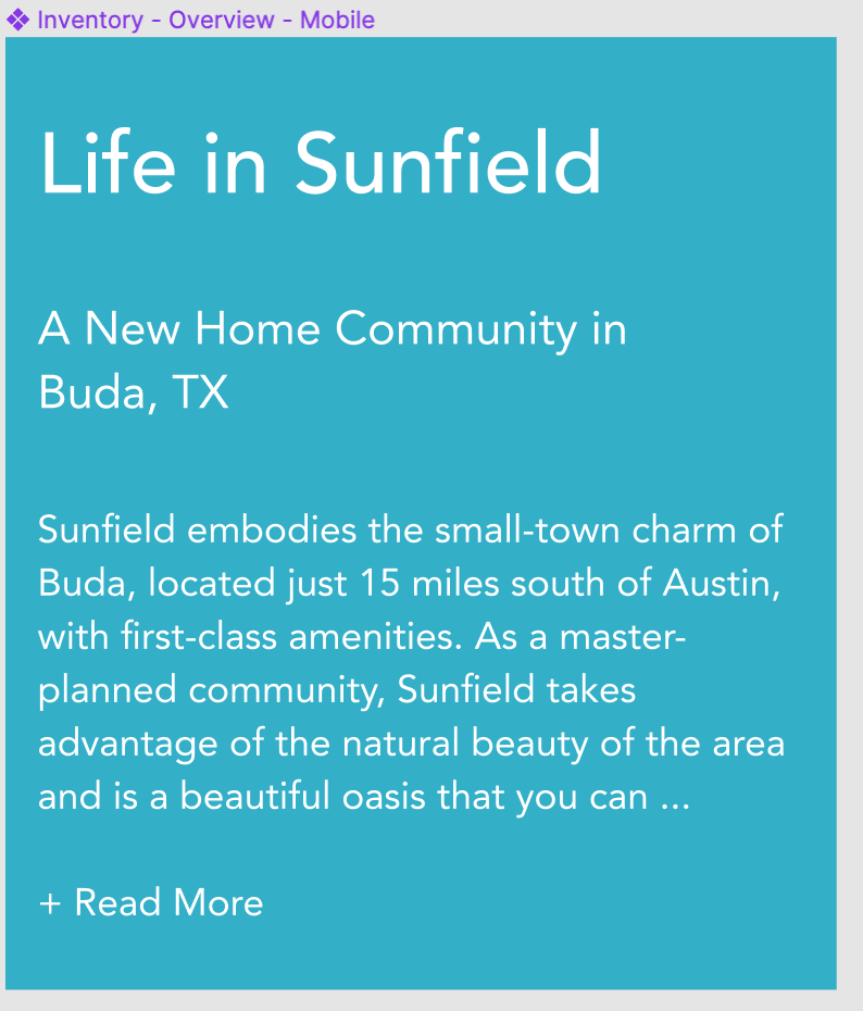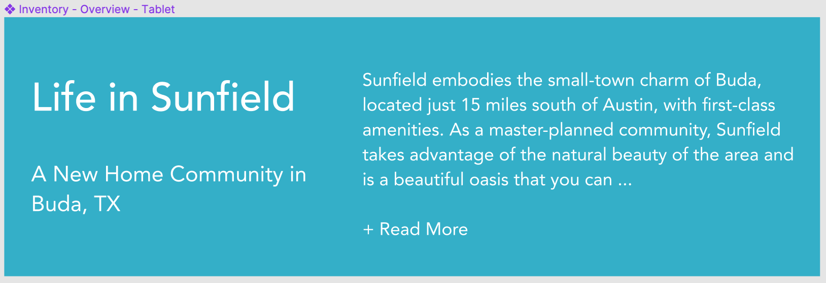- Pulls City/State from DB. Formatted as "A New Home Community in [City, State(XX)]"