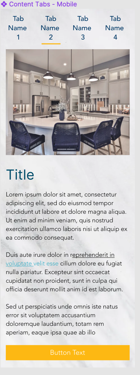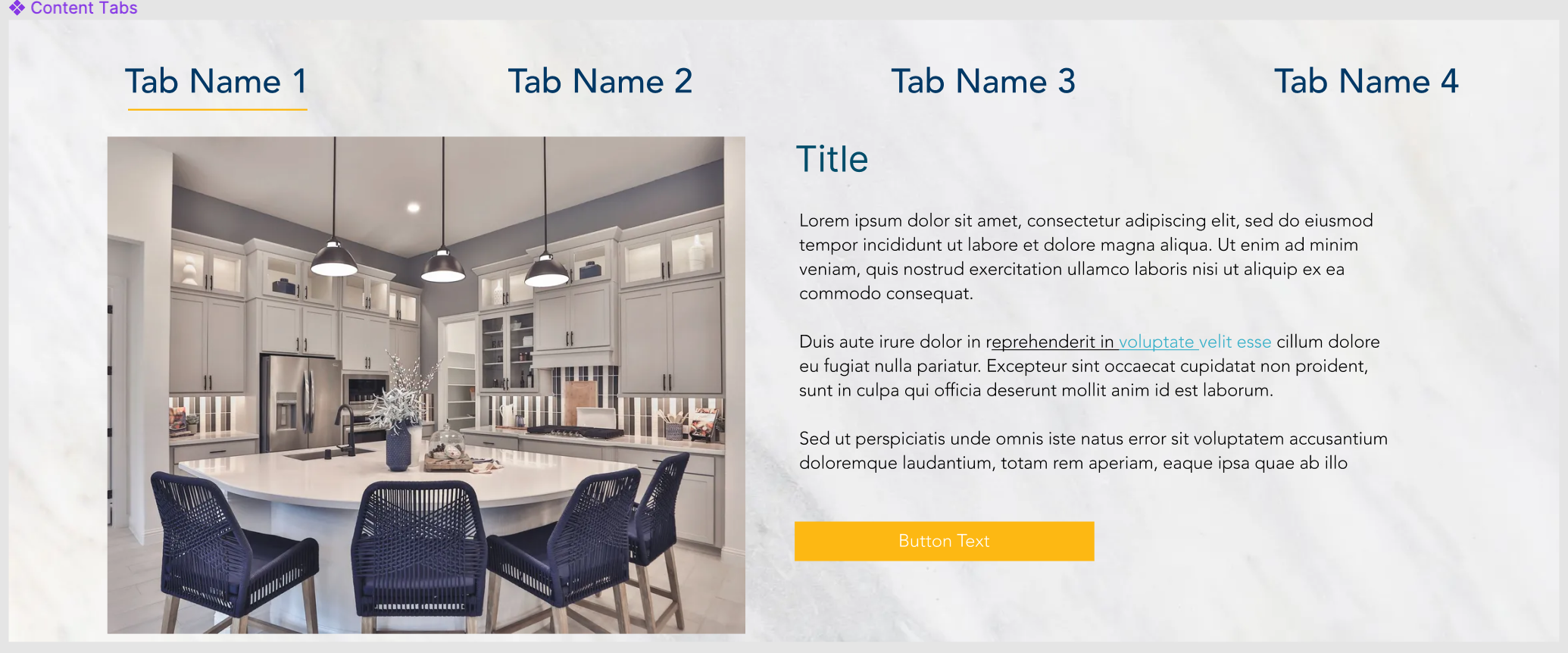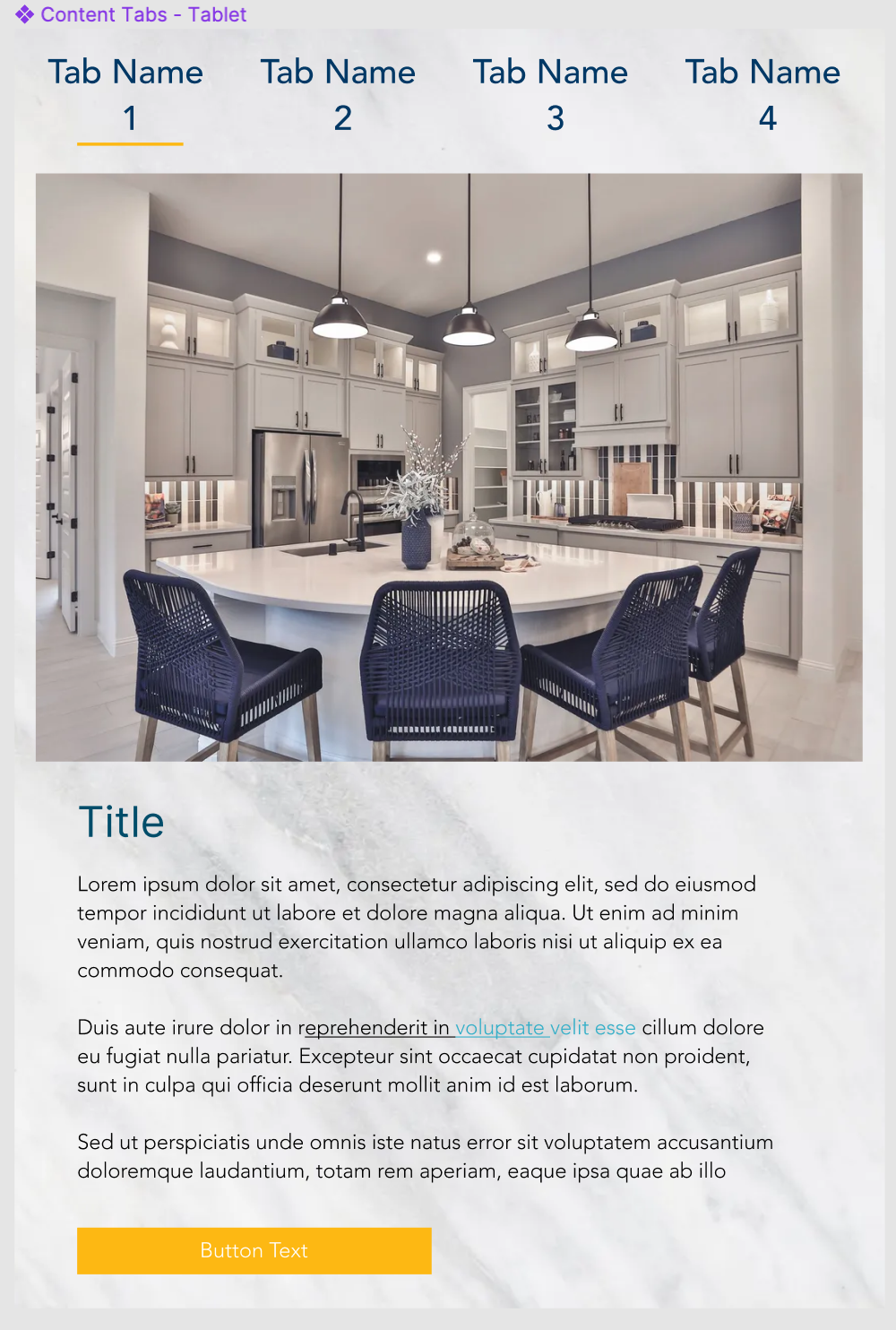ComponentsStatic / GenericContent TabsOn this pageContent TabsDescriptionCMS described Here.Static component. User can create 2 - 4 tabs.User can:Create tabs (Custome name. 2 to 4 tabs)Add media: 1 image, multiple images (slideshow), video.Add TitleChange Title font colorRich text editorCTA TextCTA Text ColorCTA ColorExamplesDesktopTabletMobile