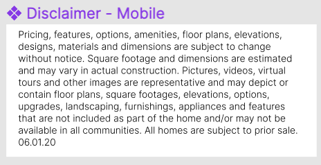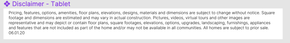ComponentsStatic / GenericDisclaimerOn this pageDisclaimerDescriptionCMS described Here.Basic text disclaimer. Rich text editor.ExamplesDesktopTabletMobileHeader Design: